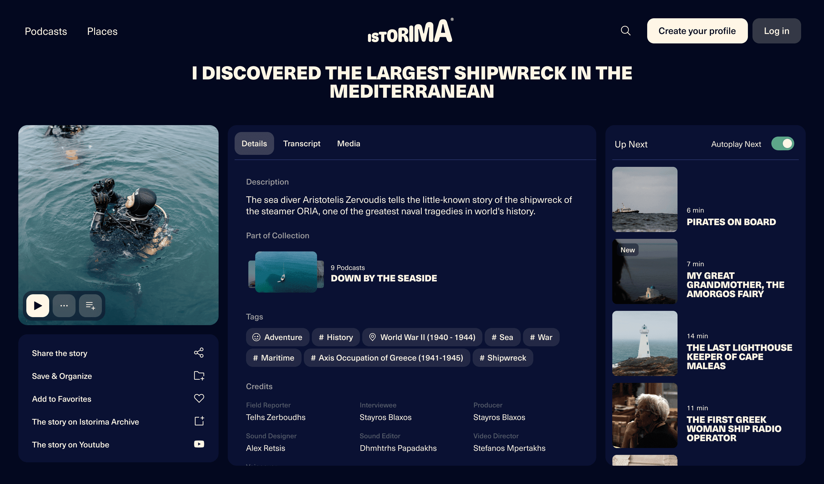 Firstly, all podcast info and credits are on first view and easily accessible, along with transcript and media content, spotlighting the human factor of Istorima’s stories and ensuring accessibility for all users. At any time, the user has multiple sharing options at hand allowing Istorima’s real stories to reach even more people around the world, while the available Autoplay list allows for content suggestions based on the user’s interests, and thus allowing for customization and smooth interaction with the stories that interest us the most. In the meantime, the always-on player at the bottom of the user’s page or screen allows free and full exploration of the platform’s content without interrupting their selected audio journey.